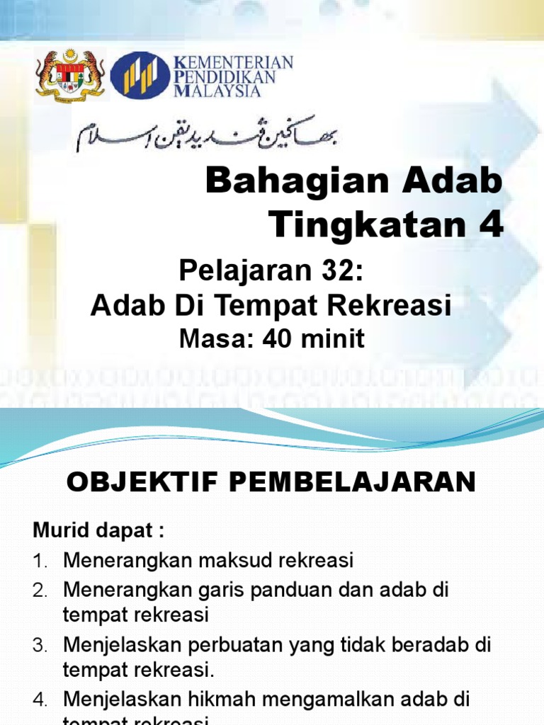 Adab di tempat rekreasi tingkatan 4. Ciri ciri tempat rekreasi yang baik. Menghormati pengunjung lain tidak mengganggu orang lain. Berpakaian menutup aurat 2. Menjaga batas batas pergaulan lelaki dan perempuan.