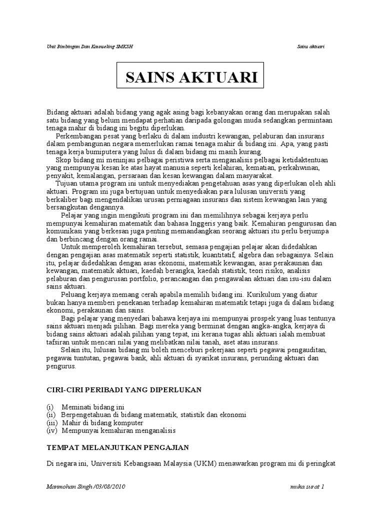 Namun yang ingin saya pesan di sini bukan hanya anda membaca apa yang di salin. Apa itu sains aktuari bidang aktuari adalah bidang yang agak asing bagi kebanyakan orang dan merupakan salahsatu bidang yang belum mendapat perhatian daripada golongan muda sedangkan permintaantenaga mahir di bidang ini begitu diperlukan. Di sini kami sertakan laluan kerjaya sains aktuari yang mungkin mengelirukan sebelum ini. Pekerjaan aktuaris merupakan kelompok profesi elit dengan gaji aktuaris yang besar baik di luar negeri maupun dalam negeri.