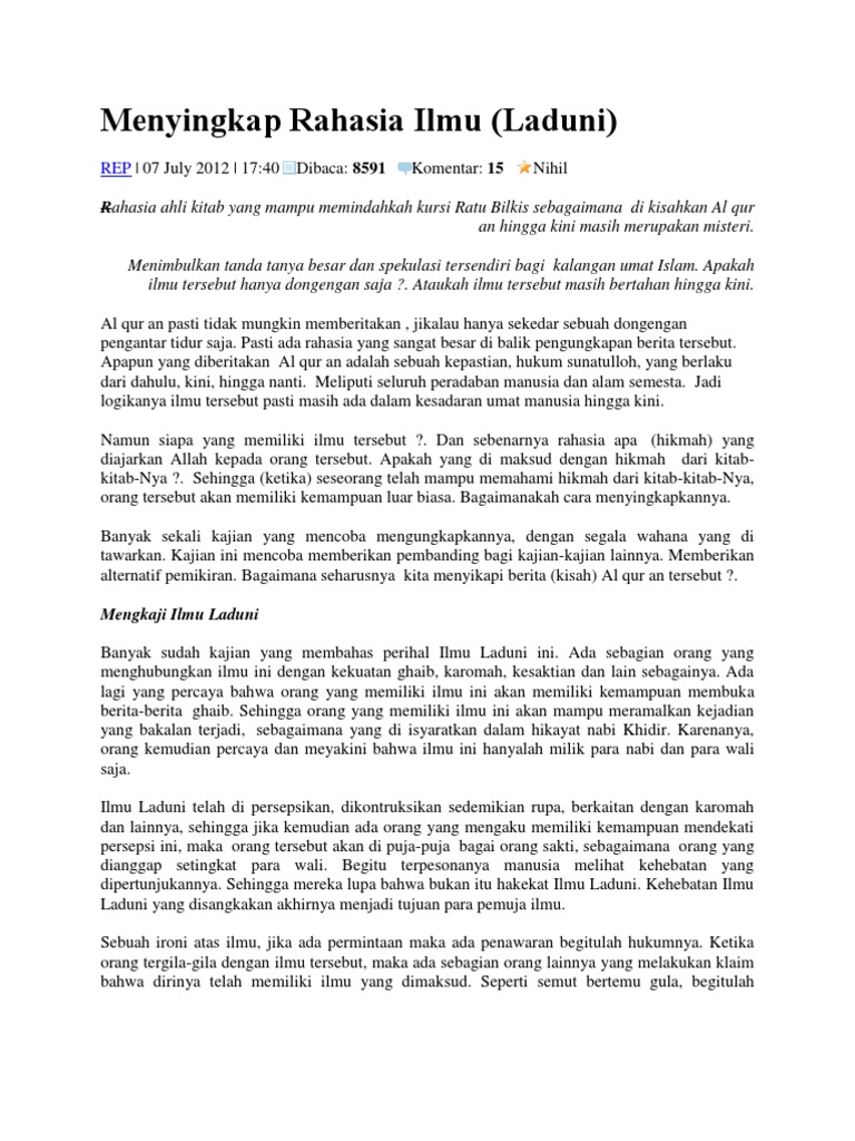 Ilmu laduni diperoleh dengan tanpa usaha belajar. Amalan doa kewibawaan secara spiritual dan kejawen. Dalil al qur an dan hadit mamfaat adab dan doanya tentang menuntut ilmu salah satu dari sekian banyak tanda datangnya hari kiamat adalah diangkatnya ilmu dari dunia maksudnya adalah bahwa suatu saat nanti ketika hari kiamat makin dekatakan datang suatu zaman yang kelompok masyarakatnyatidak peduli lagi pentingnya ilmu terlebih ilmu agama mereka seakan hidup bebas tanpa menghiraukan. Ilmu laduni adalah ilmu yang diberikan lagsung oleh allah swt kepada hamba nya yang saleh bertakwa dan selalu berusaha membersihkan hatinya dari nafsu dan sifat sifat tercela.