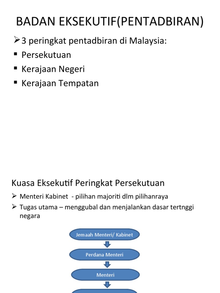 Badan yang menjalankan kuasa eksekutif di peringkat negeri. Ii portpolio seorang perdana menteri dijalankan oleh jabatan perdana menteri. I jemaah menteri merupakan badan tertinggi yang menjalankan kuasa eksekutif. A sultan yang di pertua negeri tdpt 9 buah negeri yg mempunyai sultan raja semua raja ini sultan dilantik melalui warisan. Peringkat persekutuan kabinet jemaah menteri kuasa tertinggi badan pentadbiran kerajaan persekutuan ialah sistem jemaah menteri.