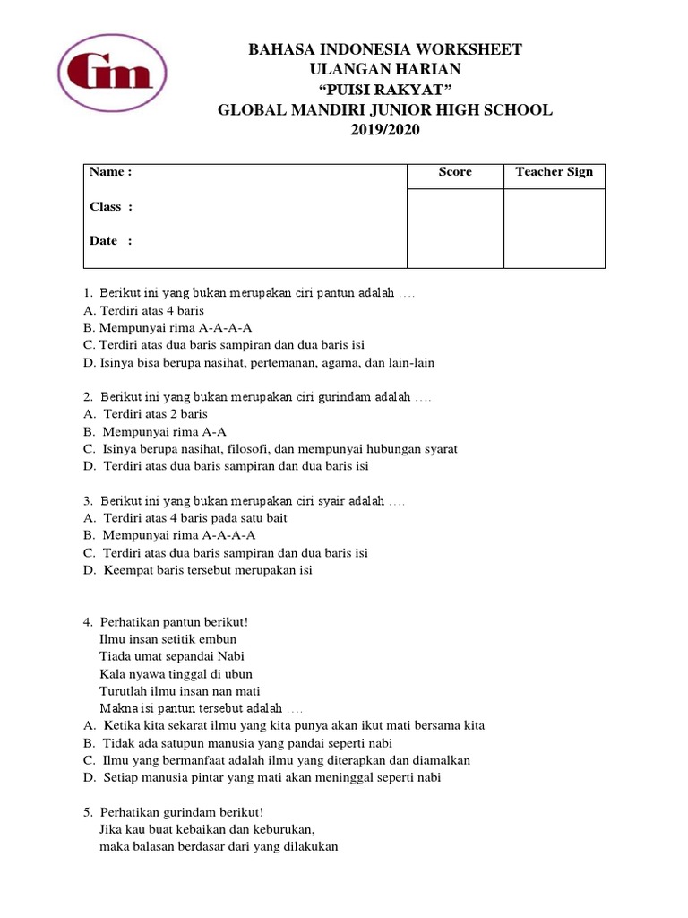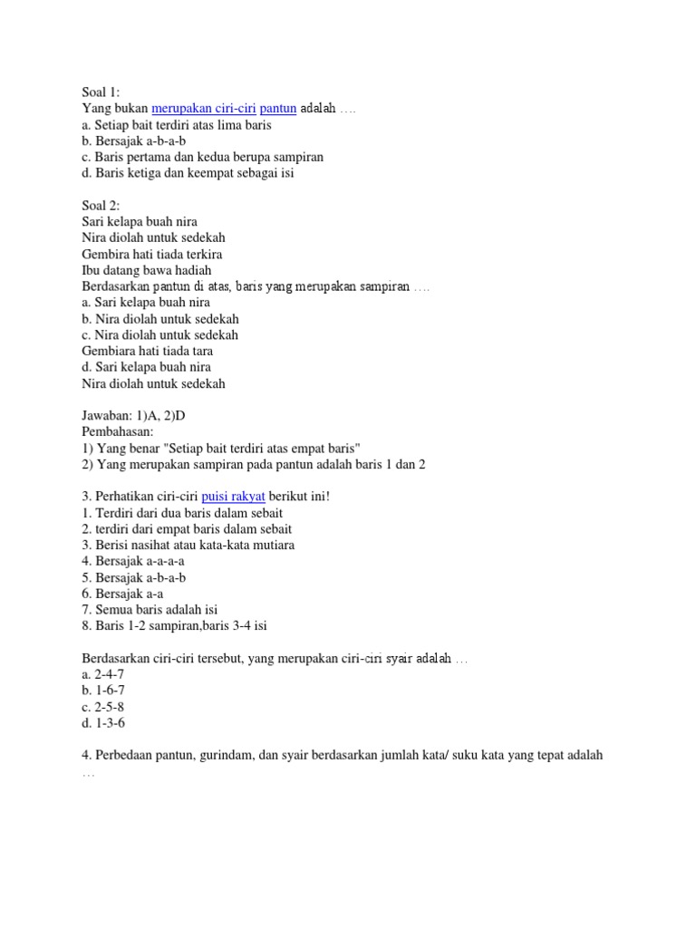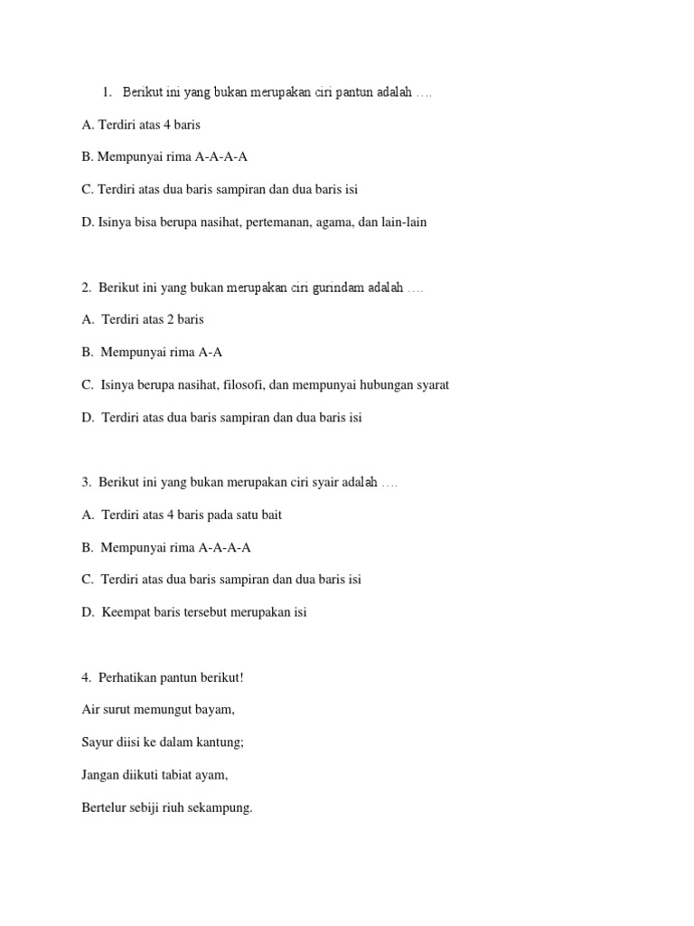 Berikut yang bukan ciri ciri pantun adalah. Terdiri dari empat baris setiap baris terdiri dari minimal 8 kata dan maksimal 12 kata. Indonesia sekolah menengah pertama 5 poin. Ada beberapa ciri ciri pantun yang membedakan pantun dengan karya sastra lain seperti puisi prosa atau talibun. Ciri ciri pantun dan penjelasannya pantun merupakan salah satu jenis puisi lama yang populer saat ini karya pantun banyak dibuat dan dibacakan biasanya bertema humor dan jenaka.