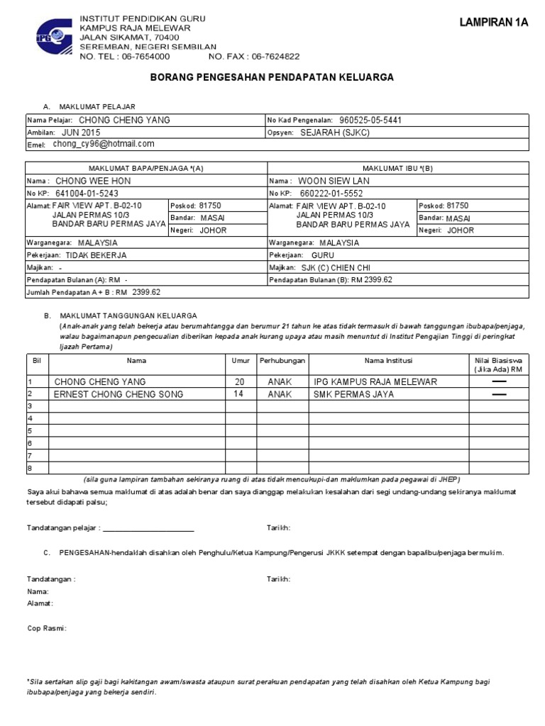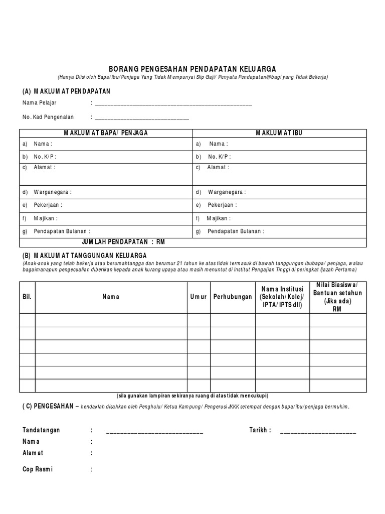 Program semester no h p. Borang pengesahan pendapatan keluarga hanya diisi oleh bapa ibu penjaga yang tidak mempunyai slip gaji penyata pendapatan bagi yang tidak bekerja a maklumat pendapatan nama pelajar. Borang pengesahan pendapatan keluarga alon program kejuruteraan c jerman perancis jepun dan korea tahun 2014 adalah betul dan benar. Borang pendaftaran bahagian b.