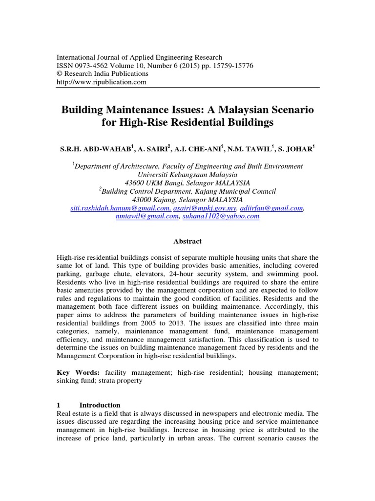 Building maintenance management in malaysia. The purpose was to assess the maintenance management systems being adopted in malaysia with the aim of improving the value of property assets through a proactive maintenance management system. High rise residential buildings consist of separate multiple housing units that share the same lot of land. Ong ching loon ceo of cofreth m sdn. Building maintenance management is a complex and multi faceted thought process that involves planning directing.