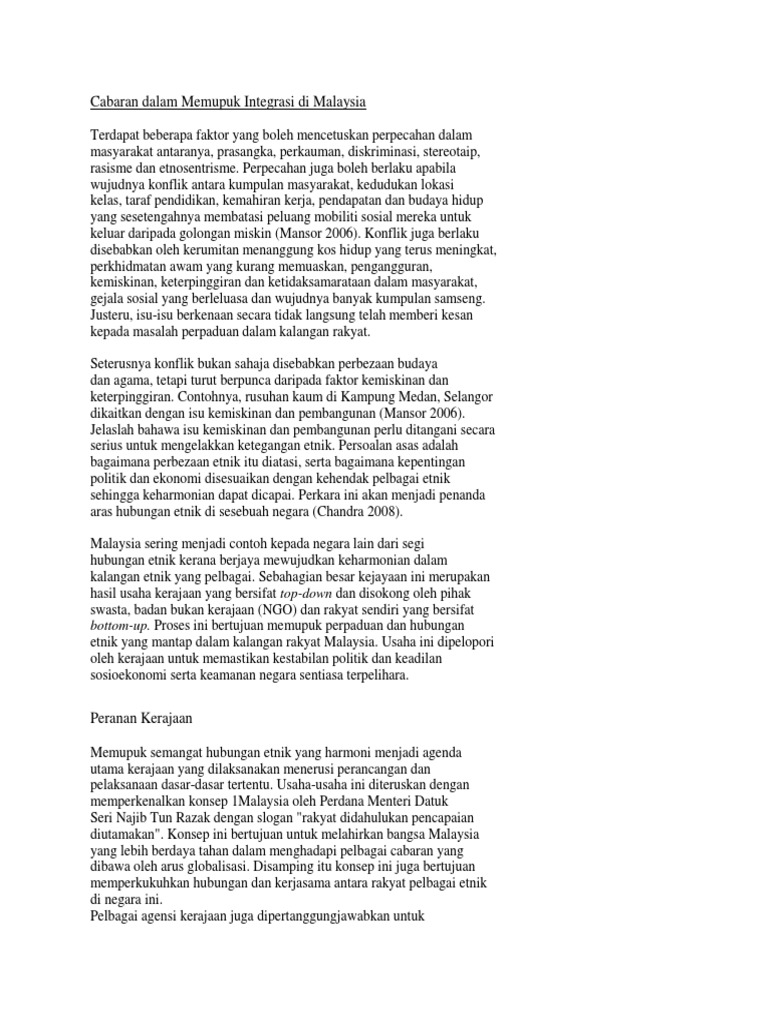 Wawasan 2020 dan dasar pembangunan negara justeru itu semua kaum di malaysia diwajibkan. Mohd ridhuan tee abdullah 2010 cabaran integrasi antara kaum di malaysia. Peristiwa berdarah 13 mei 1969 telah mengubah landskap politik ekonomi dan sosial masyarkat malaysia di mana selepas peristiwa itu berlaku pihak kerajaan telah mewujudkan dasar ekonomi baru deb yang bermatlamat mencapai perpaduan negara dan integrasi nasional. Dalam mengutarakan perpaduan dan interasi nasional terdapat tiga cabaran perpaduan dan integrasi nasional yang perlu kita ketahui cabaran utama adalah menyatupadukan rakyat di malaysia.