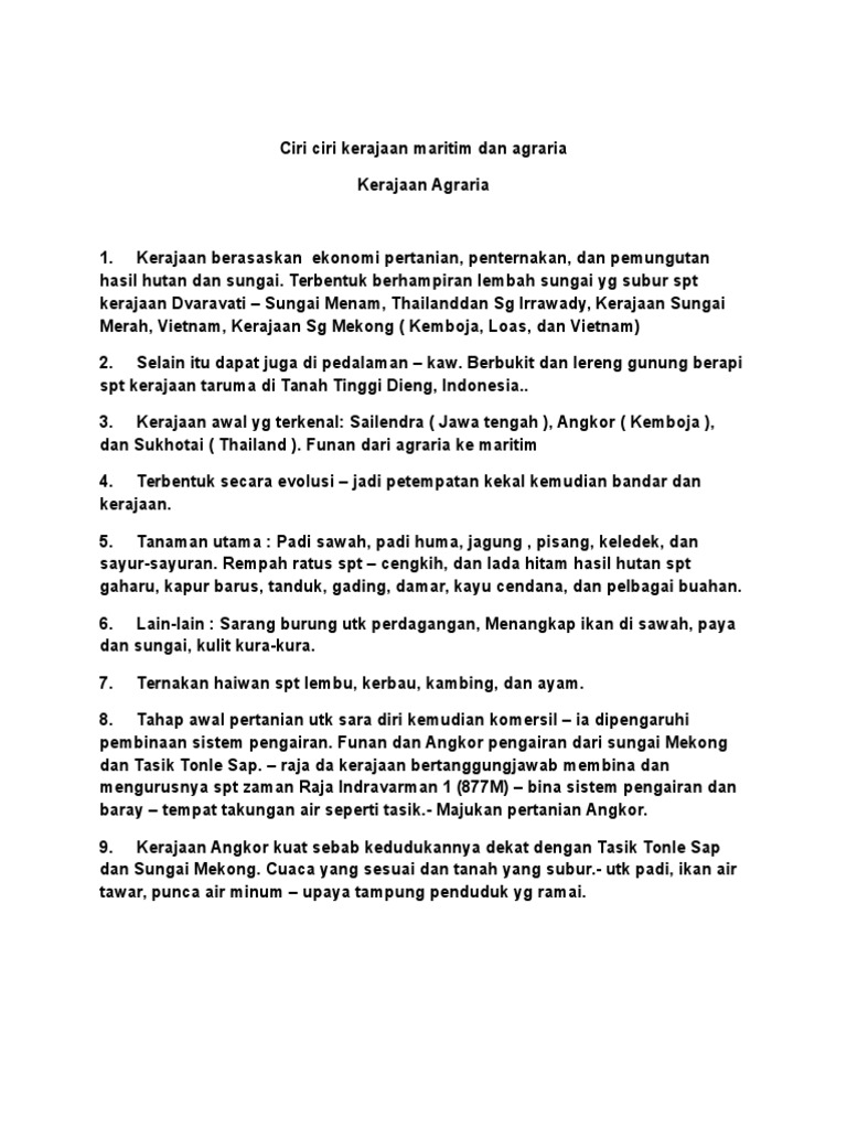 Bandingkan ciri ciri kerajaan agraria maritim 1. Nota sejarah tingkatan 4 bab 3 tamadun awal asia tenggara nota ringkas sejarah form 4 chapter 3 berkisar kepada tamadun awal asia tenggara meliputi bentuk serta ciri ciri kerajaan awal seperti kerajaan agraria kerajaan maritim. Menganut paham daulat tuanku yakni ekspresi tertinggi tentang kualitas raja dan kepemilikannya oleh seorang raja merupakan pengabsahan keilahian atas kekuasaannya. 6 markah b terangkan faktor kemajuan kerajaan angkor dalam bidang pertanian.
