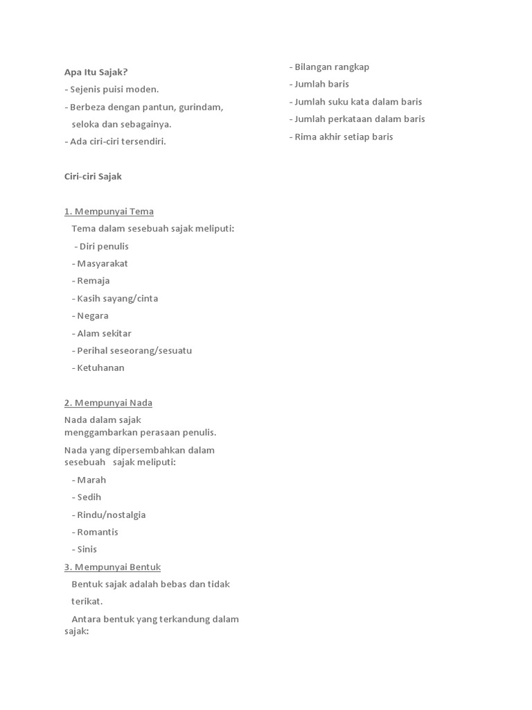 Berikut ini ciri ciri atau karakteristik sajak diantaranya yaitu. Semoga perkongsian nota nota rujukan bahasa melayu contoh contoh karangan bahan bahan pembelajaran dan pengajaran pt3 pentaksiran tingkatan 3 tingkatan 1 tingkatan 2 tingkatan 3 dalam post di blog bumi gemilang berguna dan dapat membantu para. C bilangan katanya dua hingga enam patah kata sebaris. D terdiri daripada lapan hingga tiga belas suku kata sebaris.