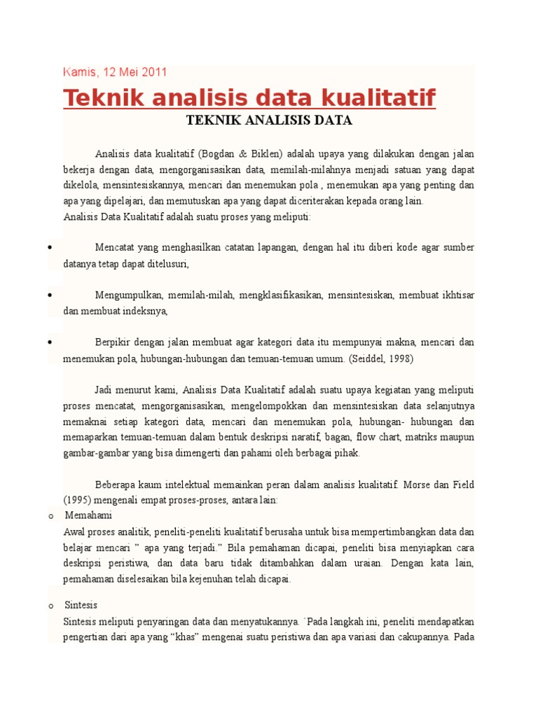 Proses pengumpulan data kualitatif yang umumnya menitikberatkan pada wawancara dan observasi partisipasipatoris membuat analisis datanya berupa analisis tekstual dari hasil transkrip atau catatan lapangan yang tidak terstruktur. Data deskriptif menunjukkan perbedaan dengan data numerik dalam hal set atau angka. Contoh teknik analisis data kualitatif penelitian. Contoh analisis data kualitatif adapun sebagai penjelas atas berbagai macam teknik analisis data dalam riset kualitatif.