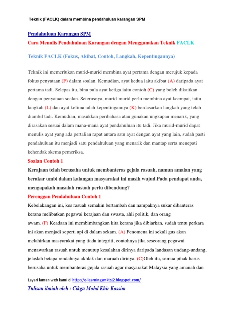 Bahagian a perenggan pendahuluan contoh 2 darsawarsa dalam menempuh arus modenisasi yang menerjah watan tanpa diundang pencemaran alam sekitar makin menjadi parah barah serta duri dalam daging watan. Koleksi contoh karangan spm bahasa melayu sijil pelajaran malaysia berikut adalah contoh contoh karangan mengikut tema yang selalu digunakan sebagai tajuk soalan karangan bahasa melayu. Contoh karangan bm spm a mengikut ceraian. Penulisan perenggan pendahuluan ini sesuai untuk karangan jenis deskriptif dan perbahasan.