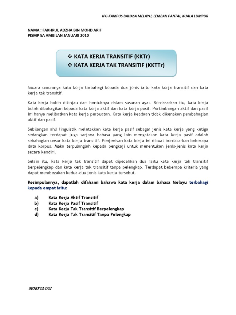 Contoh kata kerja tak transitif tanpa pelengkap. Kata kerja tak transitif berpelangkap ialah kata kerja yang mesti diikuti oleh pelengkap untuk menyempurnakan maksud ayat. Nik safiah karim et al 2004 hlmn 140 141 nik safiah karimkata kerja aktif tak transitif tanpa pelengkap ialah kata kerja yang boleh berdiri tanpa objek atau penyambut. Kata kerja tak transitif ialah segala perbuatan yang dilakukan oleh pembuat itu sendiri kepada diri pembuat itu sendiri tidak kepada benda atau orang lain. Kata kerja tak transitif tanpa pelengkap kata kerja tak transitif jenis ini tidak memerlukan apa apa unsur sebagai pelengkap.