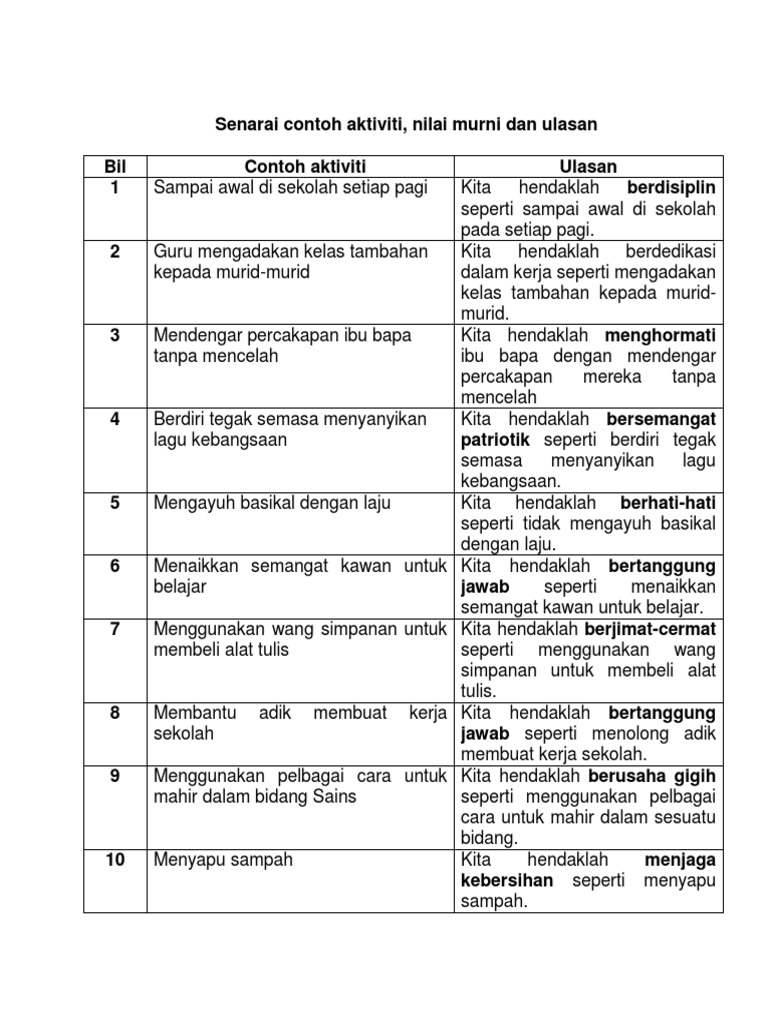 Contoh nilai murni tahun 2. 40 nilai nilai murni 1. Share share by justforfun. Beradab sopan semangat bermasyarakat kejiranan b modul jelmaan contoh modul yang saya gunakan untuk menentukan nilai murni bil penyataan nilai 1 membawa bekal menabung berjimat cermat 2 berjalan kaki ke sekolah menjaga kesihatan 3 bangun awal berdisiplin menepati masa 4 berbaris ketika naik bas masuk ke kelas berdisiplin 5 menyapu sampah rajin mementingkan kebersihan 6 bersalam. Contoh kertas peperiksaan bahasa malaysia tahun 3 kertas 2 score a notes modul bm upsr ulasan bahagian c 2.