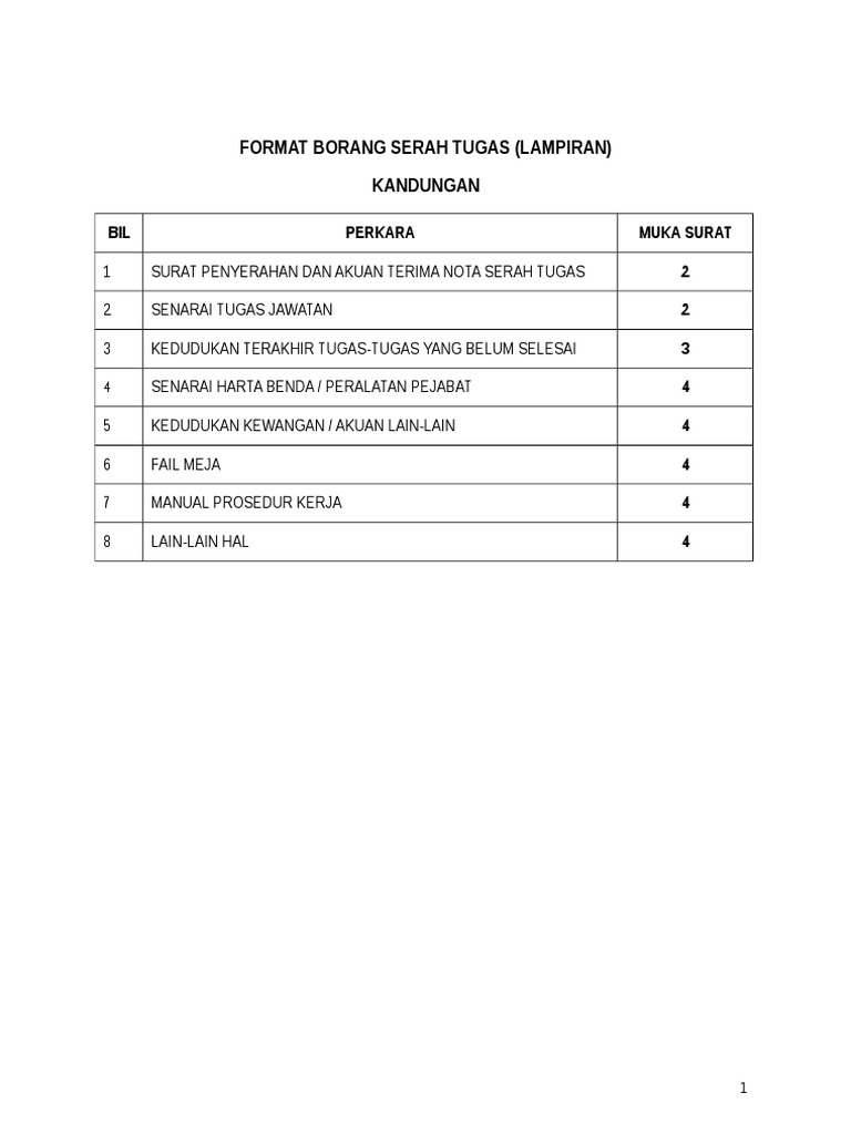 Senarai tugas guru biasa 1. Garis panduan penyediaan nota serah tugas ini disediakan bagi memberi panduan untuk membantu pihak pengurusan dan agensi agensi dibawah termasuk pejabat pelajaran daerah dan sekolah sekolah menyediakan nota serah tugas yang seragam dan sesuai mengikut format yang digunakan oleh semua kementerian dan jabatan kerajaan. Kedudukan kewangan akaun dan lain lain 6. Senarai tugas jawatan 4.