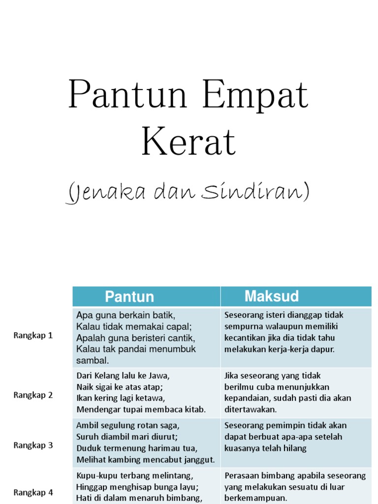 Contoh pantun pantun 4 kerat nasihat dan maksud. Pantun adalah salah satu cabang puisi tradisional melayu dicipta oleh masyarakat melayu pada zaman dulu. Kalau ada sumur di ladang boleh kita menumpang mandi kalau ada umur yang panjang boleh kita berjumpa lagi. Pantun bertujuan untuk menyampaikan nasihat sindiran gurauan dan juga boleh jadi luahan perasaan. Contoh pantun 4 kerat nasihat contoh soal dan materi pelajaran 3.