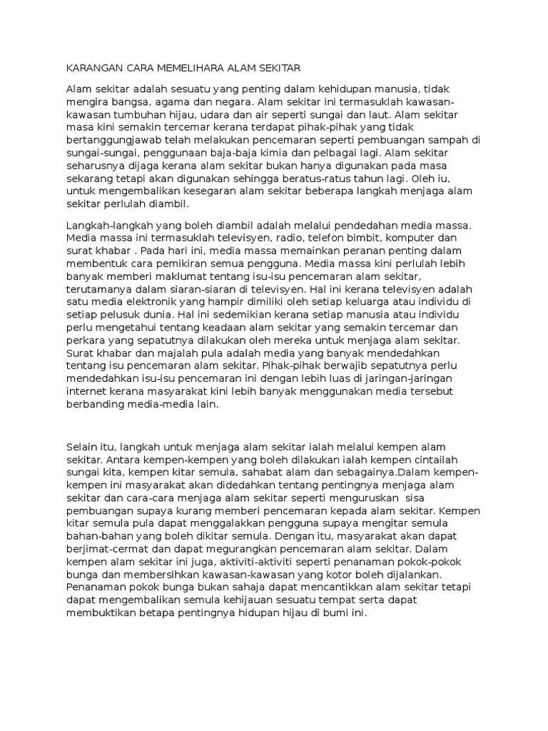 Alam sekitar yang bersih akan menjadikan kehidupan kita lebih baik. Contoh karangan kepentingan menjaga alam sekitar pendahuluan mutakhir ini kita sering kali dikejutkan dengan kejadian bencana alam yang melanda hampir kebanyakan negara serta telah meragut ribuan nyawa yang tidak berdosa. Tajuk syarahan saya pada pagi ini ialah kepentingan menjaga alam sekitar. Contoh karangan kepentingan menjaga alam sekitar contoh karangan cara cara menjaga alam sekitar contoh karangan usaha usaha menjaga alam sekitar contoh karangan menjaga alam sekitar.