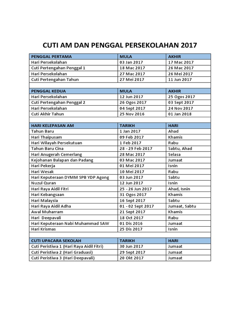 Berikut adalah senarai perincian kalendar cuti umum malaysia 2017 cuti negeri di malaysia dan cuti serta takwim penggal persekolahan bagi tahun 2017.