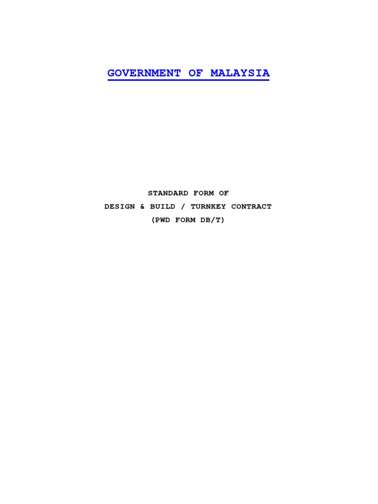 Standard form of design and build contract pwd form db rev 1 2010. A design and build contract is a single contract between the owner of a construction project and the design and build contractor. 2007 hak cipta terpelihara kerajaan malaysia. Standard form of building contract for nominated supplier to be used where bills of quantities form part of the contract in conjunction with form 203a rev 2007.