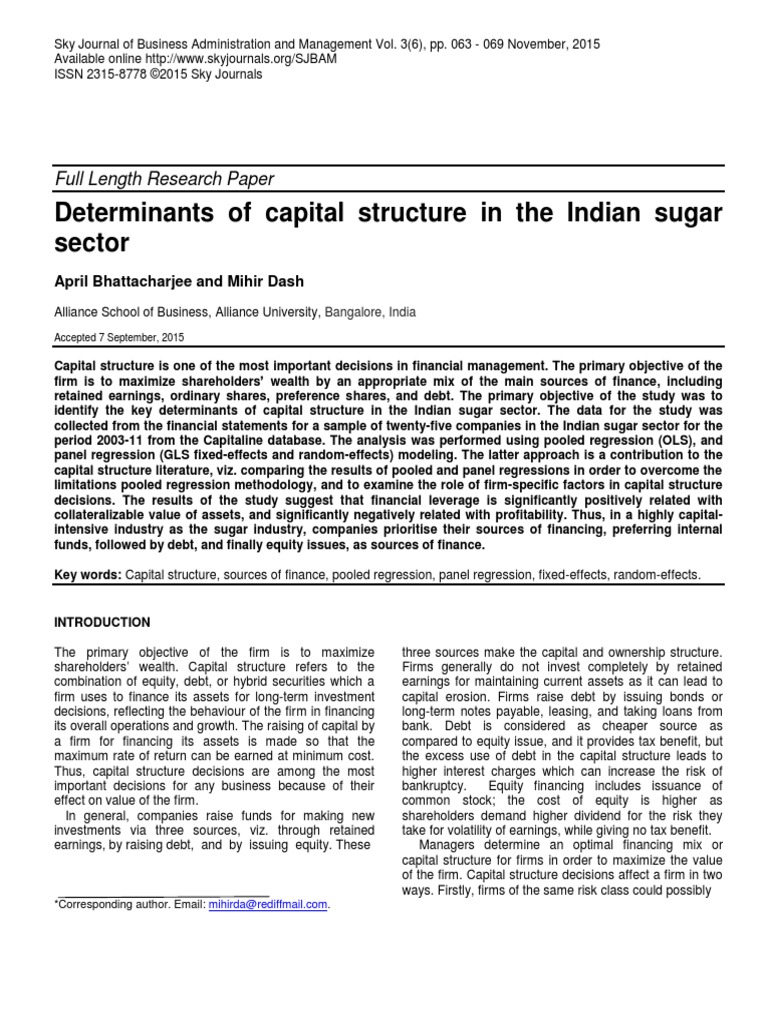 An empirical study of manufacturing firms in india international journal of law and management 10 1108 ijlma 05 2016 0051 59 6 1029 1045 2017. Meaning of capital structure. Determinants of capital structure. Volume of business 4.