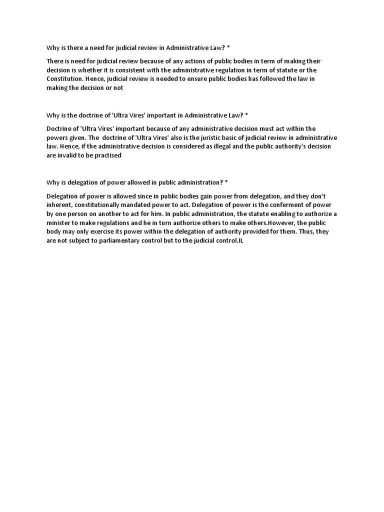 The project would firstly elaborate upon the need for judicial control over delegated legislation after which it would discuss the doctrine of ultra vires. The doctrine envisages that an authority can exercise only so much power as is conferred on it by law. The doctrine of ultra vires is produced by the constitutional principles of the rule of law the sovereignty of parliament and the independence of the judiciary. Thereafter factors which make delegated legislation subject to judicial review would be.