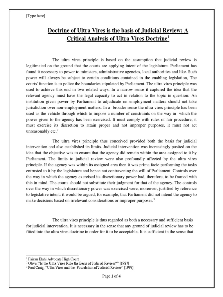 The motive behind the doctrine of ultra vires is to protect the investors and creditors of the company. Having seen the rational behind the ultra vires doctrine and the rules developed by courts to temper this doctrine it should be understood that there is always a thin line separating what is incidental or consequential to a certain power already granted and what is clearly ultra vires and as a result there is a lot of subjectivity involved in deciding what is ultra vires and what is not. The doctrine of ultra vires and judicial review of administrative action. The company being an artificial person its objects and powers are specified in the memorandum of association moa of the company.