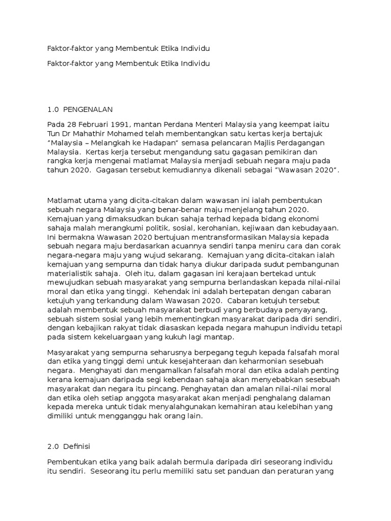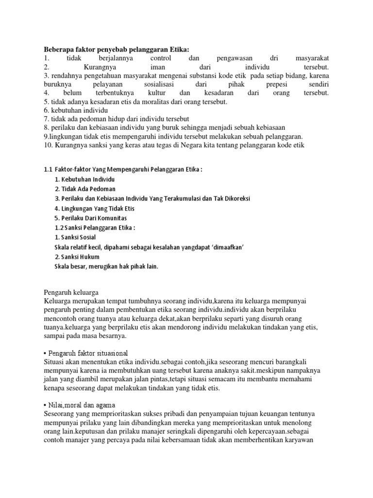 Kanak kanak membentuk piawai etika mereka apabila persepsi mereka mula bertindak balas terhadap kelakuan ibu bapa mereka. Rajah 1 1 faktor pembentukan etika individu 2 1 pengaruh keluarga family influence pengaruh keluarga memainkan peranan p enting d alam pembentukan etika peribadi. 1 1 faktor faktor yang mempengaruhi pelanggaran etika. Lingkungan yang tidak etis 5.