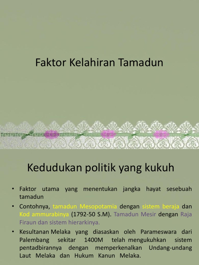 Faktor utama kelahiran tamadun islam. Antara faktor faktor tersebut adalah seperti berikut. La juga menekankan dan menyeru keadilan untuk semua insan sama ada islam atau bukan islam kawan. Pemerintah yang lemah negara yang diperintah oleh pemerintah yang lemah akan mudah menjadi kucar kacir ketidakstabilan politik kelumpuhan ekonomi dan perpecahan negar menjadi wilayah wilayah kecil. Manakala tamadun lain lazimnya bermula di kawasan lembah sungai.