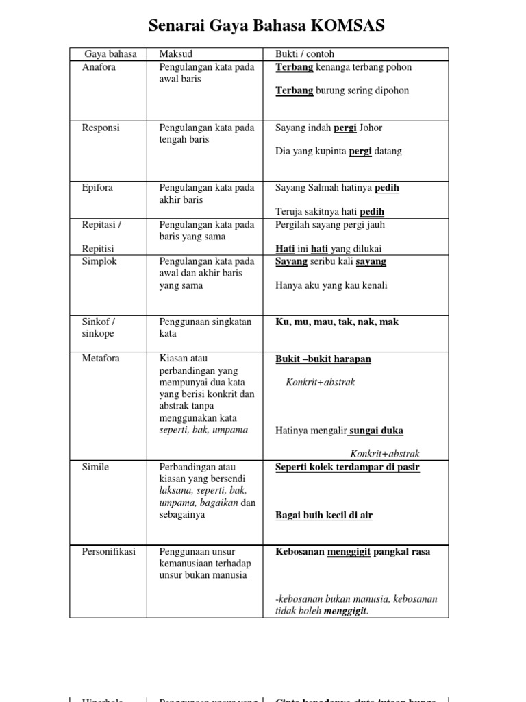 Gaya bahasa dalam komsas. Pernyataan yang dibuat secara berlebih lebihan dalam usaha menekankan sesuatu pandangan idea atau peristiwa. Gaya bahasa dalam komsas gaya bahasa dalam komsas gaya bahasa susunan kata yang digunakan oleh pengarang dalam usaha mengungkapkan tema dan persoalan dalam karya. Berikut dihimpunkan jenis jenis gaya bahasa bersama istilah istilah yang berkaitan dengannya bagi memudahkan pelajar memahami konsep asas gaya bahasa secara menyeluruh. Epifora pengulangan kata pada akhir baris sayang salmah hatinya pedih teruja sakitnya hati pedih 4.