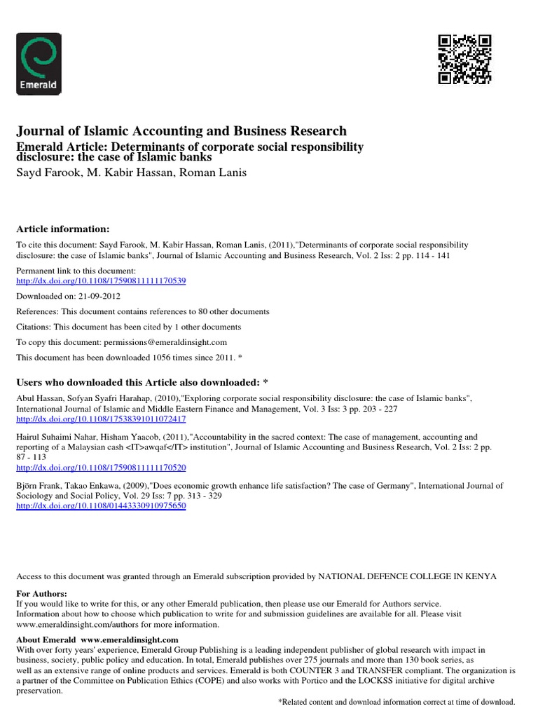 The purpose of this paper is to address the. Journal of islamic accounting and business research business management 1759 0817. Jiabr is recognised as an important platform for those interested in gaining knowledge and finding alternative solutions to protect society from unethical business conducts and to uphold justice based on the precepts of islamic philosophy and practice. The economic consequence for adopting accounting standards is one of the growing and valuable topics in accounting research.