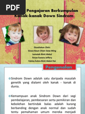 Kanak kanak sindrom down pdf. Sindrom down ialah penyakit keturunan disebabkan oleh kromosom tambahan pada kromosom nombor 21 yang terdapat pada seorang kanak kanak. Walaupun mereka mempunyai rupa fizikal dan mental yang serba kekurangan namun kita perlulah melihat kekurangan mereka kepada sudut yang lebih positif. Penyakit ini juga dikenali sebagai trisomy 21. Sering kali kanak kanak ini mengalami masalah pemikiran iaitu terencat akal sama ada pada tahap sedikit ataupun sederhana.