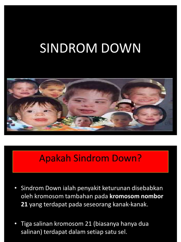 Ciri ciri murid berkeperluan khas syndrome down sindrom down disebabkan kelainan pada kromosom. Download pdf share. Kromosom adalah merupakan serat serat khusus yang terdapat di dalam setiap sel di dalam badan manusia dimana terdapat bahan bahan genetik yang menentukan sifat sifat seseorang bayi normal dilahirkan dengan jumlah 46 kromosom 23 pasang iaitu hanya sepasang kromosom 21 2 kromosom 21. Instability dimana ini berlaku di kalangan 10 kanak kanak down syndrom.