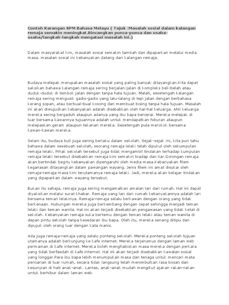 Dalam masyarakat kini masalah sosial semakin tambah dan dipaparkan melalui media masa. Masalah gejala sosial ini telah menjadi perdebatan hangat dalam kalangan pemimpin sehingga menimbulkan kebimbangan tentang masa depan para remaja. Masalah sosial remaja sijil pelajaran malaysia. Karangan bahasa melayu bm spm.