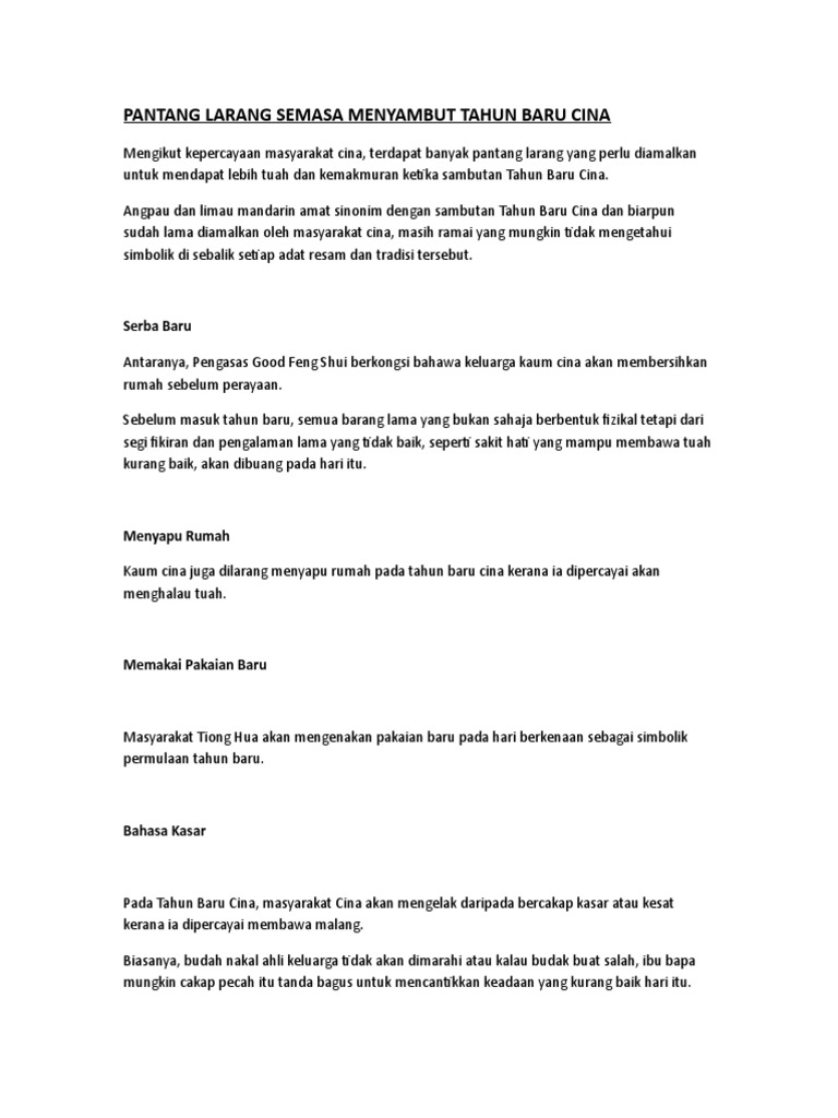 Karangan tentang tahun baru cina. Tahun baru cina diraikan dengan jamuan yee sang dan kuih bakul. Setiap binatang ini memberi signifikan dan tuahnya yang tersendiri. Memakai selipar baru yang dibeli sebelum tahun baru bermaksud memijak orang yang bergosip tentang pemakainya. Tahun baru cina diserikan dengan ucapan yang diucap dengan kuat yang dikenali sebagai ungkapan pembawa tuah cina tradisional.