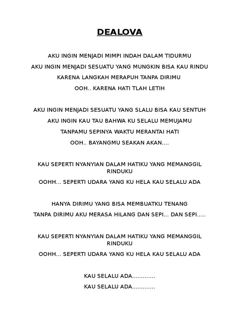 Kau seperti nyanyian dalam hatiku. Chord kunci gitar lirik lagu dealova once mekel kau seperti nyanyian dalam hatiku yang memanggil berikut chord kunci gitar dan lirik lagu dealova yang dinyanyikan eks vokalis dewa 19 once mekel. Kau seperti nyanyian dalam hatiku yang memanggil rinduku padamu seperti udara yang ku hela kau selalu ada kau selalu ada kau selalu ada kau selalu ada kau selalu ada. Yang selalu ada dan selalu ada. Kau seperti nyanyian c e dalam hatiku yang memanggil am e rinduku padamu woo.