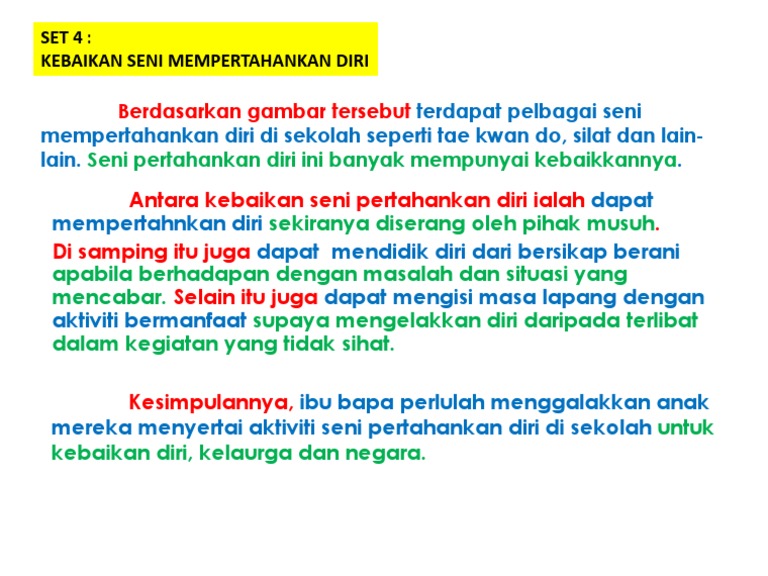 Jadi kita tidak seharusnya beranggapan bahawa seni tersebut tidak lagi sesuai dengan arus pembangunan masa kini dan mengabaikannya hal ini turut disebabkan oleh seni pertahanan diri merupakan warisan budaya yang tidak ternilai harganya dan patut dikekalkan oleh masyarakat. Hal ini terjadi kerana kita telah diajar cara cara untuk mengelakkan serangan dan menyelamatkan diri dalam seni pertahanan diri ini justeru kita akan dapat bertindak dengan pantas sekiranya menghadapi saat saat yang mencemaskan itu. Ipendidikan karangan kebaikan dan faedah mempelajari seni mempertahankan diri disemak dan dikemaskini pada pukul 3 04 pm 8 mei 2020 sering kali pelajar mempunyai kesukaran apabila ingi menjawab soalan penulisan karangan bahasa melayu. Seni mempertahankan diri merupakan cara terbaik untuk anak anda membina jati diri di samping meningkatkan tahap kecergasan dan kecerdasan mereka.