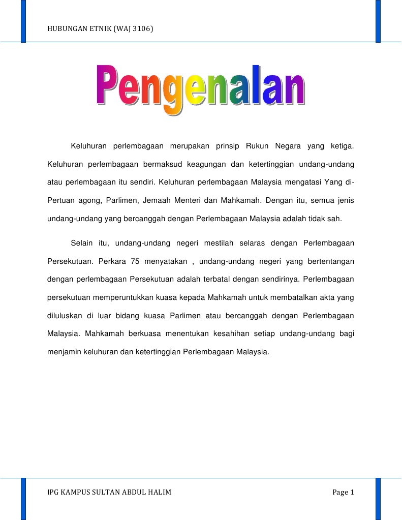 Perlembagaan malaysia dikenali juga sebagai perlembagaan persekutuan yang mengandungi 183 perkara adalah undang undang tertinggi di malaysia. Keluhuran perlembagaan malaysia terletak pada kedudukannya sbagai undang undang tertinggiyg m jadi sumber punca kpda semua undang undang. Perlembagaan negara adalah sumber perundangan yang tertinggi. Fungsinya untuk memberi perlindungan kepada setiap rakyat negara ini akan hak dan keistimewaan mereka sebagai warganegara.