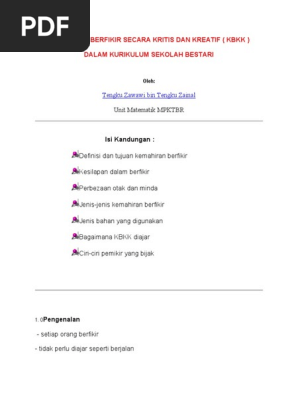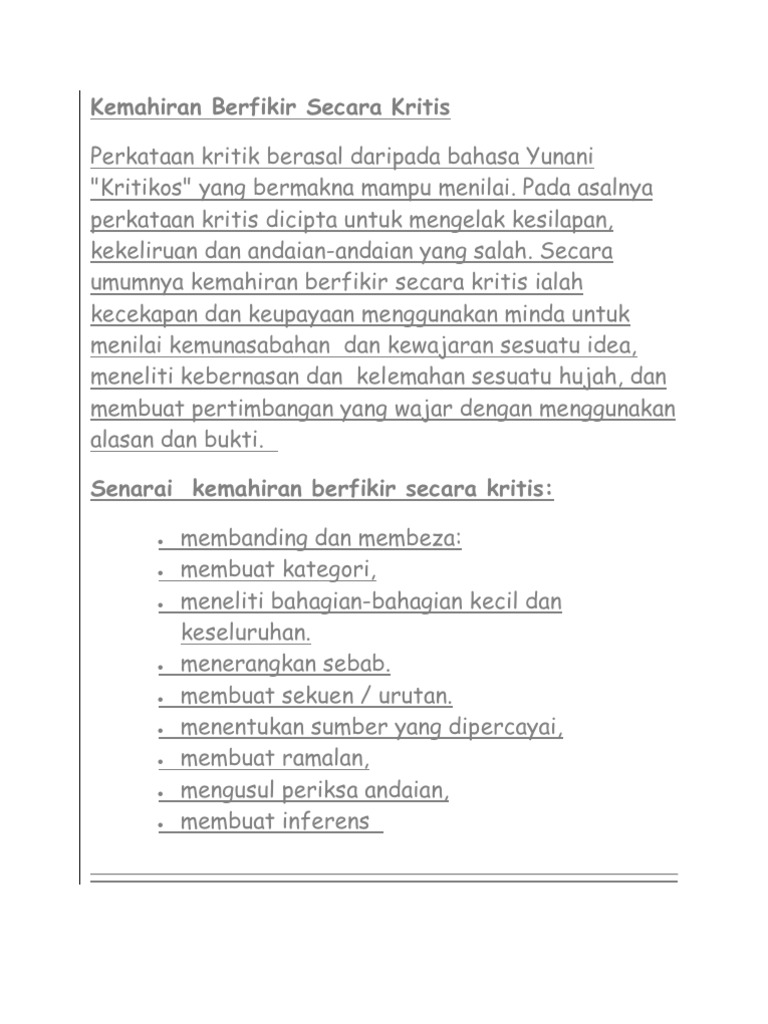 Kemahiran berfikir secara kreatif kritis dan inovatif cikgu hailmi sabtu november 09 2013 ithink bermaksud innovative thinking pemikiran inovatif yang bertujuan untuk mempertingkatkan dan membudayakan kemahiran berfikir dalam kalangan pelajar ke arah menghasilkan pelajar yang kreatif kritis dan inovatif. Kemahiran berfikir secara kritis dan kedepan under maintenance ads sample percuma panduan pengurusan kewangan bakal pengantin. Sunday 16 january 2011. Walaupun kemahiran berfikir secara kritis dan kreatif bukan diajar sebagai mata pelajaran namun unsur unsurnya perlu disepadukan bagi semua mata pelajaran.