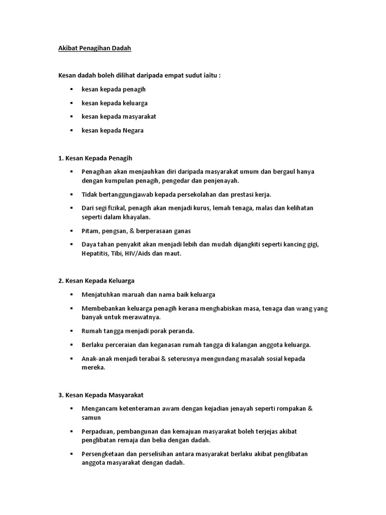 Permasalahan dadah kepada diri kerjaya dan keluarga. Peningkatan kes kes sosial dan jenayah seperti budaya samseng kecurian rompakan rogol pembunuhan dan sebagainya. Oleh itu sama samalah kita berjuang untuk membanteras gejala pengambilan dadah dan menjadikan negara kita ini sebuah negara yang selamat dan sihat daripada gejala gejala dadah. Penyalahgunaan dadah adalah isu yang rumit dan telah menjadi masalah kesihatan awam yang serius di malaysia.