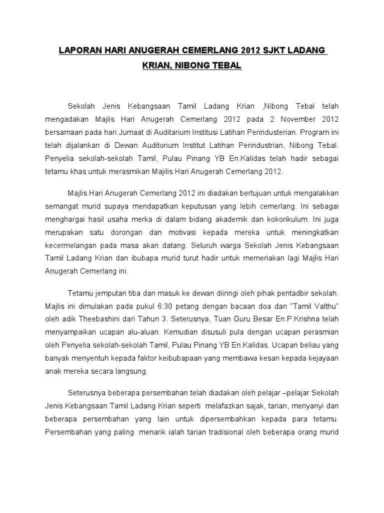 Kesan hari anugerah cemerlang. Hal demikian mencetuskan semangat kami untuk terus berkongsi. Hadiah yang disediakan oleh pihak sekolah sewajarnya meliputi kecemerlangan pelajar dalam. Sebagai setiausaha kamu diminta menulis laporan hari anugerah tersebut. Majlis hari anugerah cemerlang bermula seawal 8 45 pagi selepas kehadiran yb mary josephine prittam singh adun rahang.