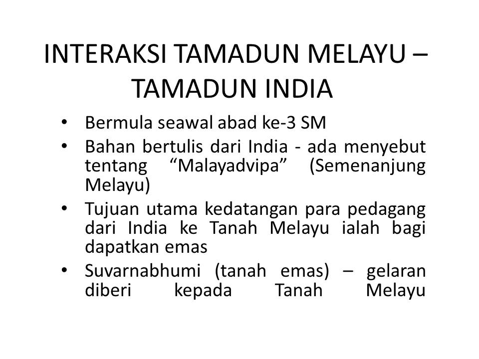 Kesan interaksi tamadun india tamadun melayu. Cara penyebaran islam dari china ialah melalui hubungan diplomatik iaitu perkahwinan puteri hang li po dengan sultan melaka dan perdagangan iaitu melalui pedagang dari canton dan hainan pada kurun ke 9. Kesan interaksi antara tamadun melayu dengan tamadun india kepada masyarakat malaysia sekarang. Buktinya bahan bertulis dari india ada menyebut tentang malayadvipa yang bermaksud semenanjung melayu. Bahasa dan kesusasteraan melayu.