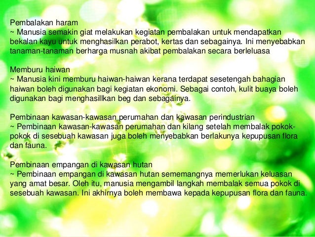 Hasilnya kita kini diancam kepupusan ratusan spesies binatang. Didapati lebih kurang 12 500 spesies tumbuh tumbuhan berbunga dan lebih daripada 1 100 spesies paku pakis yang masih lagi menghuni hutan negara kita. Tindakan manusia yang membawa kepada kepupusan flora dan fauna 10. Penerokaan sumber hutan akan menyebabkan flora dan fauna terancam kerana kehilangan habitat untuk membiak dan kekurangan sumber makanan.