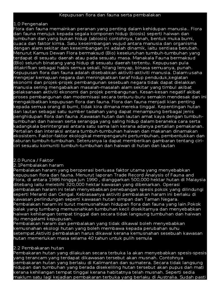 Kesan kepupusan flora dan fauna kepada negara dan masyarakat. Lambat laun beberapa spesies tumbuh tumbuhan dan haiwan akan pupus antara beberapa spesies mamalia di maaysia yang diancam kepupusan ialah badak sumatera gajah harimau dan orang utan sumber. Blog ini akan membincangkan tentang punca punca kepupusan flora dan fauna kesan kesan kepupusan dan langkah langkah yang dianggap sesuai untuk mengatasi masalah ini. Alert 2001 sahabat alam malaysia. Kesan kepupusan flora dan fauna.
