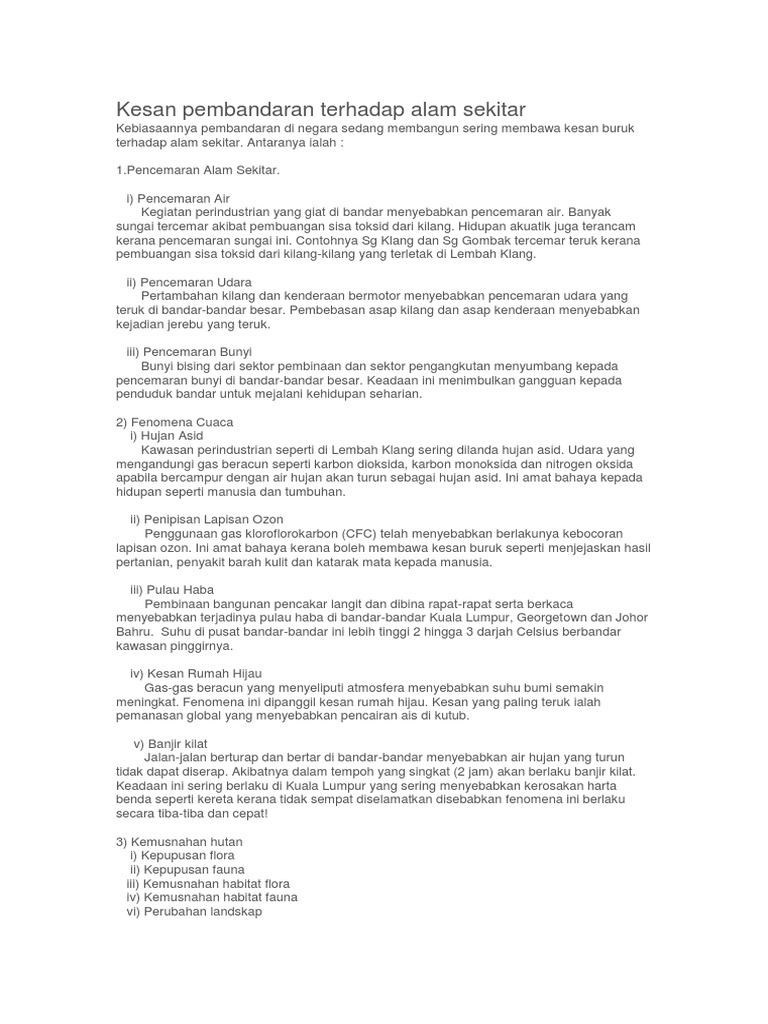Kesan pembinaan terhadap alam sekitar. Punca penebangan hutan yang tidak terkawal kegiatan pertanian intensif pembuangan sisa toksik perlombongan dilakukan berterusan tanpa kawalan tumpahan minyak di laut kegiatan perikanan menggunakan pukat harimau dan pukat tunda kesan kepupusan flora dan fauna kerana kehilangan habitat dan sumber makanan memusnahkan habitat hidupan akuatik. 1 pencemaran udara dan jerebu jerebu ini berlaku apabila kesan dari aktiviti perkilangan yang membebaskan bahan bahan seperti karbon monoksida dan karbon dioksida. Kesan pencemaran terhadap alam sekitar sangat meluas antaranya ialah. Fenomena hujan berasid fenomena ini berlaku apabila jerebu merebak keseluruh tempat.