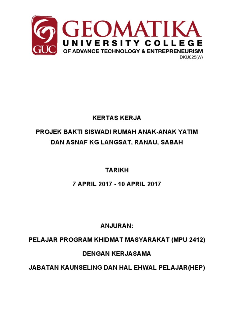 Kertas kerja cadangan bagi program khidmat masyarakat di rumah anak anak yatim nurul ihsan sg siput 1 0 tujuan kertas kerja ini bertujuan untuk mendapatkan kelulusan seminar dan projek pelajar untuk menganjurkan program loving is caring bagi memenuhi syarat kerja kursus mata pelajaran khidmat masyarakat mpu 3412. 2 0 latar belakang 2 1 program ini merupakan satu usaha untuk memberi. Program khidmat masyarakat team marhaen puchong pada 13 9 2018 jumlah. Melalui mata pelajaran ini pelajar dikehendaki merancang melaksanakan dan membuat laporan berkenaan projek yang dilaksanakan.