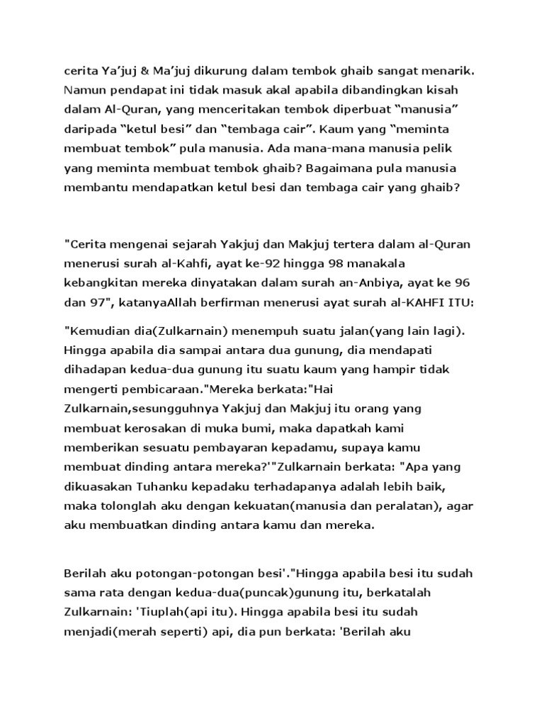 Al quran hanya menjelaskan sifat sifat mereka iaitu kaum pembuat kerosakan di bumi kalau tembok penghalang dibuka mereka akan turun mengalir seperti mengalirnya air bah dan apabila tembok penghalang kukuh mereka tidak masuk dan tidak dapat membuat kerosakan. Justeru amat penting umat islam memahami akan perihal ya juj dan ma juj yang sebenarnya. يأجوج و مأجوج atau gog dan magog dalam tradisi ibrani yahudi גוג ומגוג adalah sebutan yang muncul dalam kitab suci umat islam al quran serta kitab kitab agama lain mengenai sekelompok manusia yang memiliki kekuatan sebagai perosak dan penghancur kehidupan di muka bumi. Dhul qarnayn dan berkaitan kaum yajuk makjuj dalam bahasa arab satu makna kerana ada isim mafhul yg di gelombang nyalaan kalau ada huruf mim atau huruf m di depan nya menjadi gelombang yg di nyalaakan kerana dalam ayat tersebut tiada value perkataan kaum perkataan kaun tidak ada pada ayat tersebut anda boleh semak sendri hanya ada nun taukit sahaja kaum itu adalah dalam.