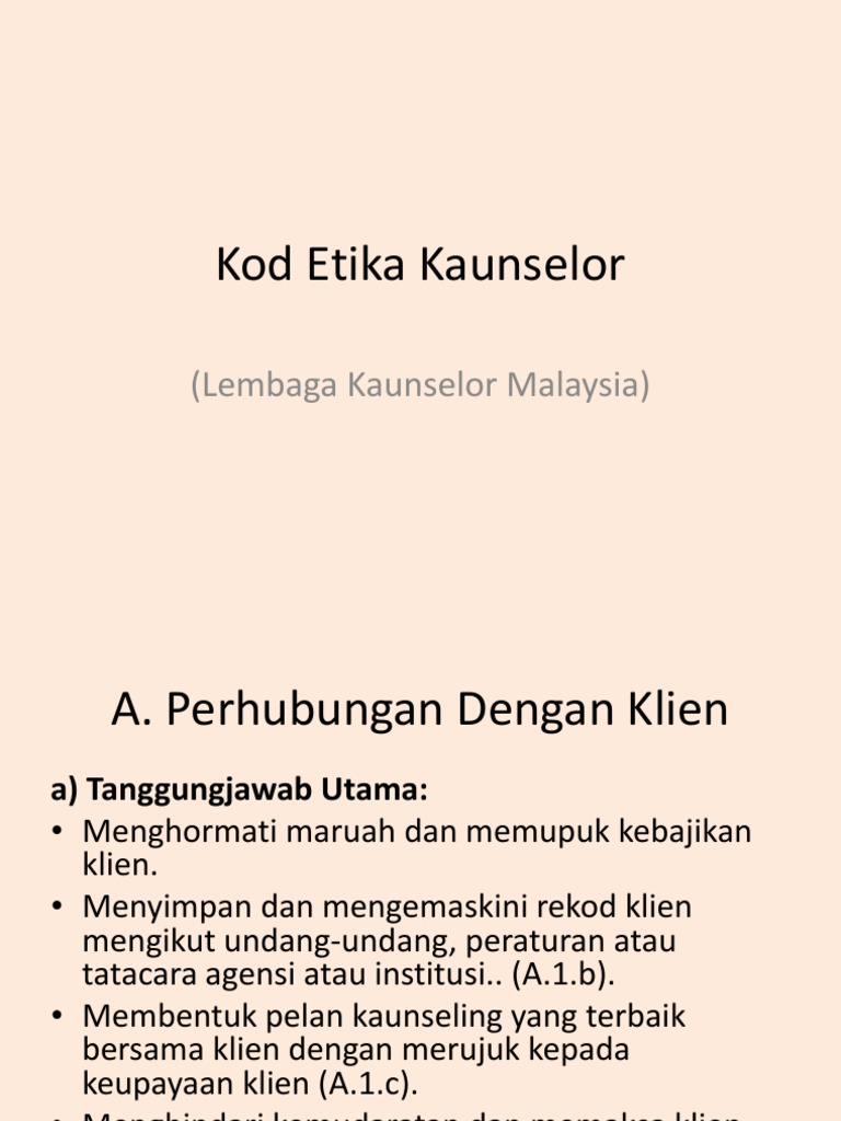 Kod etika kaunselor please copy. Prakatasebagai seorang kaunselor profesional seseorang kaunselor berdaftar yangmengamalkan kaunseling bukan sahaja perlu menguasai ilmu dan kemahirankaunseling individu kelompok kaunseling perkahwinan dan keluarga memiliki ciri ciripersonaliti serta nilai nilai tertentu bahkan ia juga amat perlu. Kod etika profesional juga mengariskan bahawa dalam perkhidmatan kaunseling kaunselor seharusnya menjaga kesejahteraan klien yang datang mendapatkan khidmat kaunseling. Kajian ini menggunakan reka bentuk kajian korelasi.