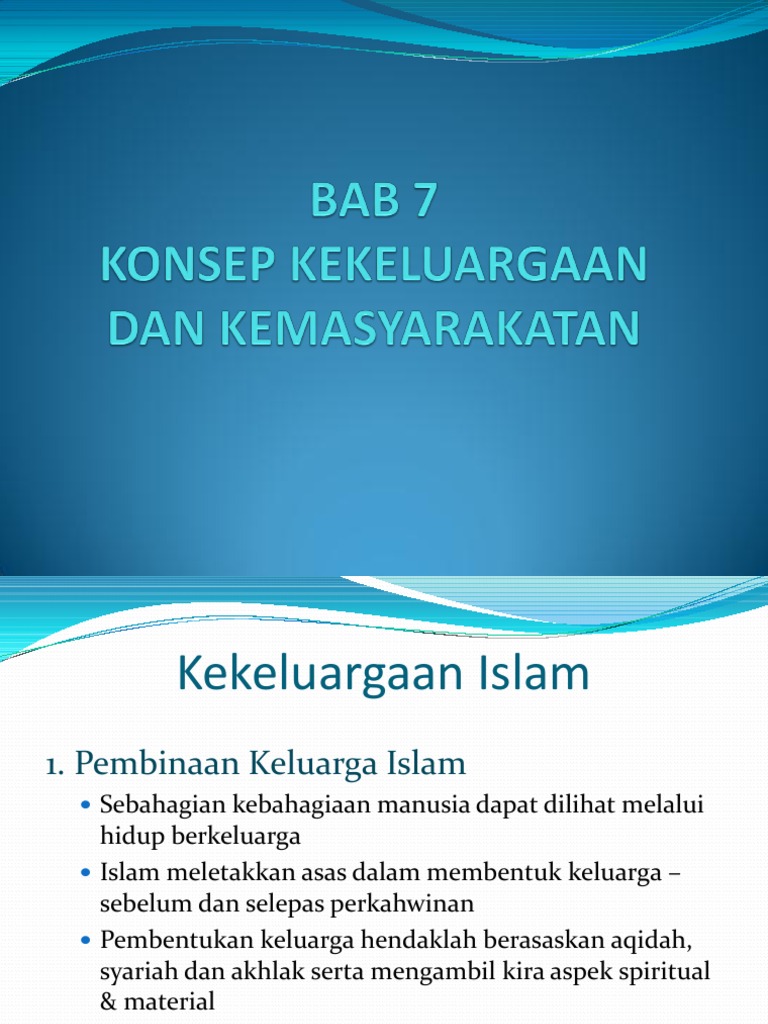 Pembinaan keluarga islam sebahagian kebahagiaan manusia dapat dilihat melalui hidup berkeluarga islam meletakkan asas dalam membentuk keluarga sebelum dan selepas perkahwinan pembentukan keluarga hendaklah berasaskan aqidah syariah dan akhlak serta mengambil kira aspek spiritual material matlamat berkeluarga mampu melahirka generasi yang cemerlang di dunia dan.