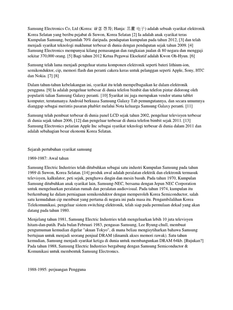 Latar belakang syarikat samsung. Samsung juga dikenal sebagai perusahaan yang mempunyai inovasi yang tinggi. Latar belakang rumusan cadangan kesimpulannya syarikat samsung electronics malaysia merupakan sebuah syarikat yang terkenal dan merupakan antara pesaing utama bagi syarikat multinasional yang lain. Dalam masa sedekad samsung mempunyai kilang tepung dan mesin mesin gula. Rahasia samsung adalah merekut tenaga kerja yang punya potensi dan gila akan inovasi.