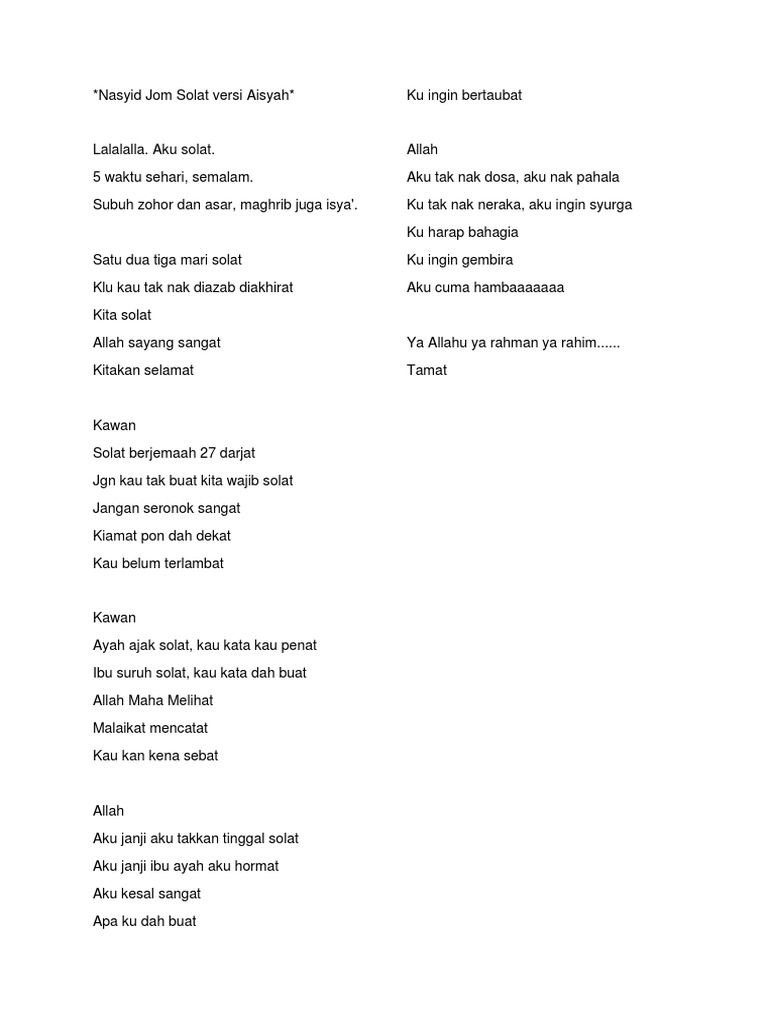 Kalau ada malas malas tu mari cikgu sha nak korang nyanyi lagu mari solat. Lirik nasyid jom solat versi aisyah. 5 waktu sehari semalam. Si vous avez un lien vers votre propriété intellectuelle indiquez le nous par envoyer un email avec le lien.