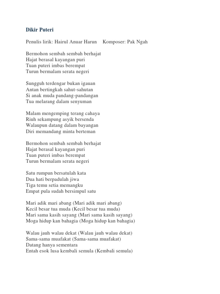 Puteri lembaga islam riang gembira tetap taat kepada allah dan raja. Lirik lagu puteri islam malaysia pergerakan puteri islam malaysia. Bermohon sembah sembah berhajat hajat berasal kayangan puri hamba puteri imbas berempat turun bermalam serata negeri 1 bermohon sembah sembah berhajat hajat berasal kayangan puri tuan puteri imbas berempat turun bermalam serata negeri sungguh terdengar bukan igauan antan bertingkah sahut sahutan si anak muda pandang pandangan tua melarang dalam. Bermohon sembah sembah berhajat hajat berasal kayangan puri hamba puteri imbas berempat turun bermalam serata negeri 1 bermohon sembah sembah berhajat hajat berasal kayangan puri tuan puteri imbas berempat turun bermalam serata negeri sungguh terdengar bukan igauan antan bertingkah sahut sahutan si anak muda pandang pandangan tua melarang dalam.