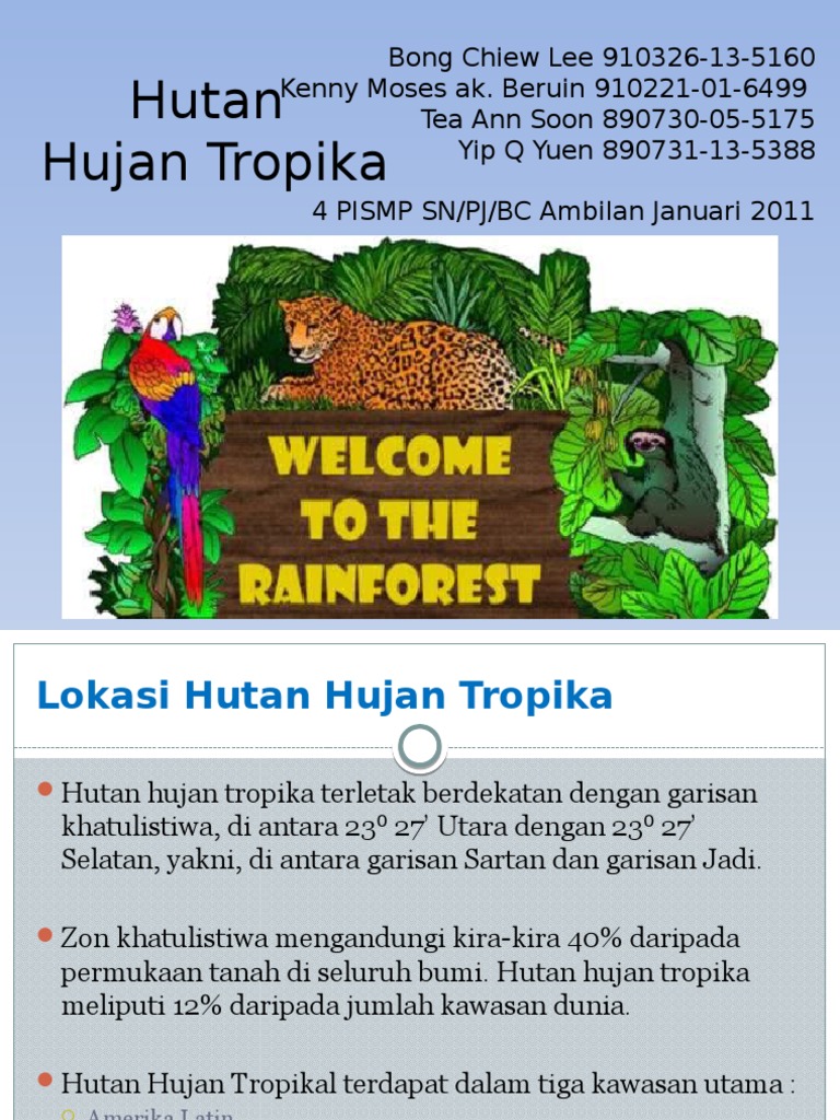 Lokasi hutan hujan tropika hutan hujan tropika terdapat di zon tropika di antara 23027 utara dan 23027 selatan. Ianya juga satu warisan alam semulajadi ciptaan allah yang maha esa yang sangat unik dan telah pun wujud lebih dari berjuta juta tahun. Hutan hujan tropika tumbuh dengan subur di kawasan yang mempunyai ketinggian kurang daripada 1000meter. Satu hektar kawasan hutan hujan tropika mengadungi hampir 200 spesies tumbuhan.