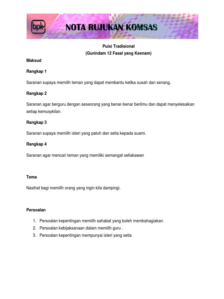 Gurindam termasuk ke dalam puisi lama yang banyak terdapat dalam masyarakat melayu indonesia. Rangkap pertama menasihati kita supaya mencarl sahabat yang boleh membantu kita ketika kita dalam kesusahan. Nota komsas gurindam 12 fasal yang keenam. Gurindam ini dinamakan gurindam dua belas karena gurindam tersebut terdiri dari dua belas pasal.