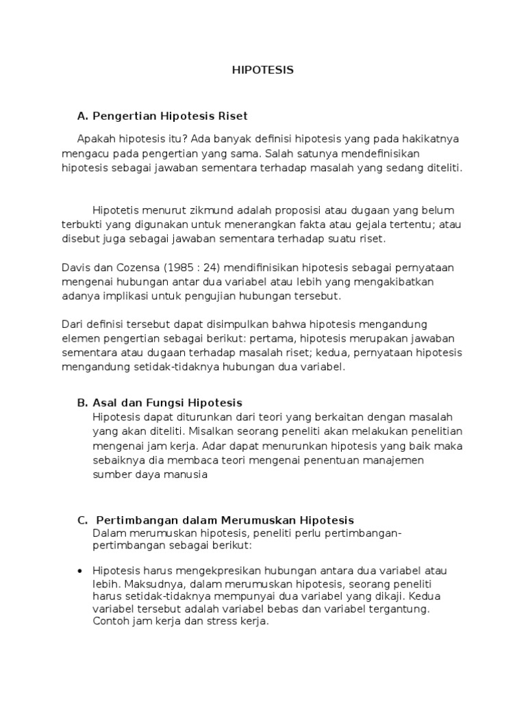 Nasution hipotesis adalah dugaan tentang apa yang kita amati dalam upaya untuk memahaminya nasution 2000 zikmund 1997 112 menurut zimund hipotesis adalah proposisi atau dugaan belum terbukti bahwa tentatif menjelaskan fakta atau fenomena serta kemungkinan jawaban atas pertanyaan pertanyaan penelitian. Pengertian hipotesis menurut para ahli. Ini penting untuk penelitian ilmiah karena berfungsi sebagai kompas bagi para ilmuwan atau peneliti dalam melakukan eksperimen atau studi mereka. Dalam sains suatu hipotesis perlu melalui banyak pengujian sebelum diberi label teori.